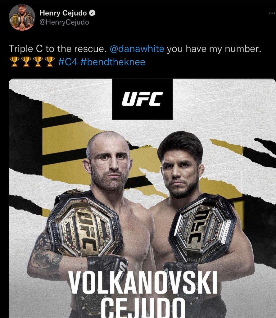 The fight most fans would like to see involves the return of former flyweight and bantamweight champion, Henry Cejudo. Cejudo would be looking to become the first three division UFC champion, a feat no one would even think of a few years ago. Cejudo looks up for the challenge as well, telling Dana White he has his number on twitter.