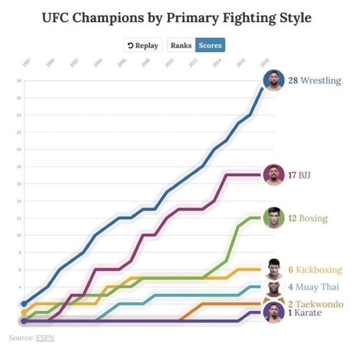 This graphic shows the primary style of fighting used by UFC champions from 1997 to 2018.