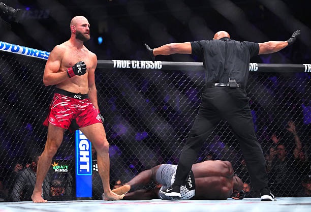 He instantly went on the attack forcing the issue and keeping the champion on his toes and within one minute delivered a stunning right hand that caught Ankalaev that made the Russian dive for the takedown, allowing for Poatan to deliver brutal ground and pound hammer fists and elbows for the win.