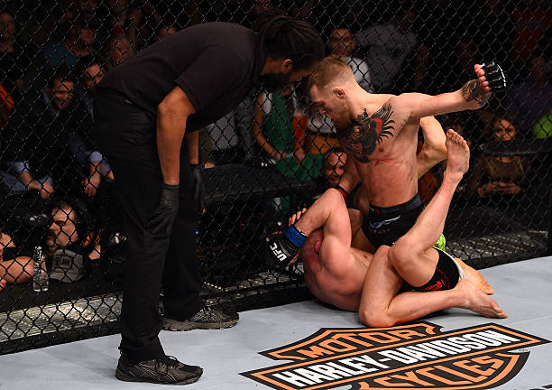 Then, late in the second, McGregor stuffed a takedown, landed clean strikes, and battered Mendes to the canvas. The referee waved it off. McGregor was the interim featherweight champion.